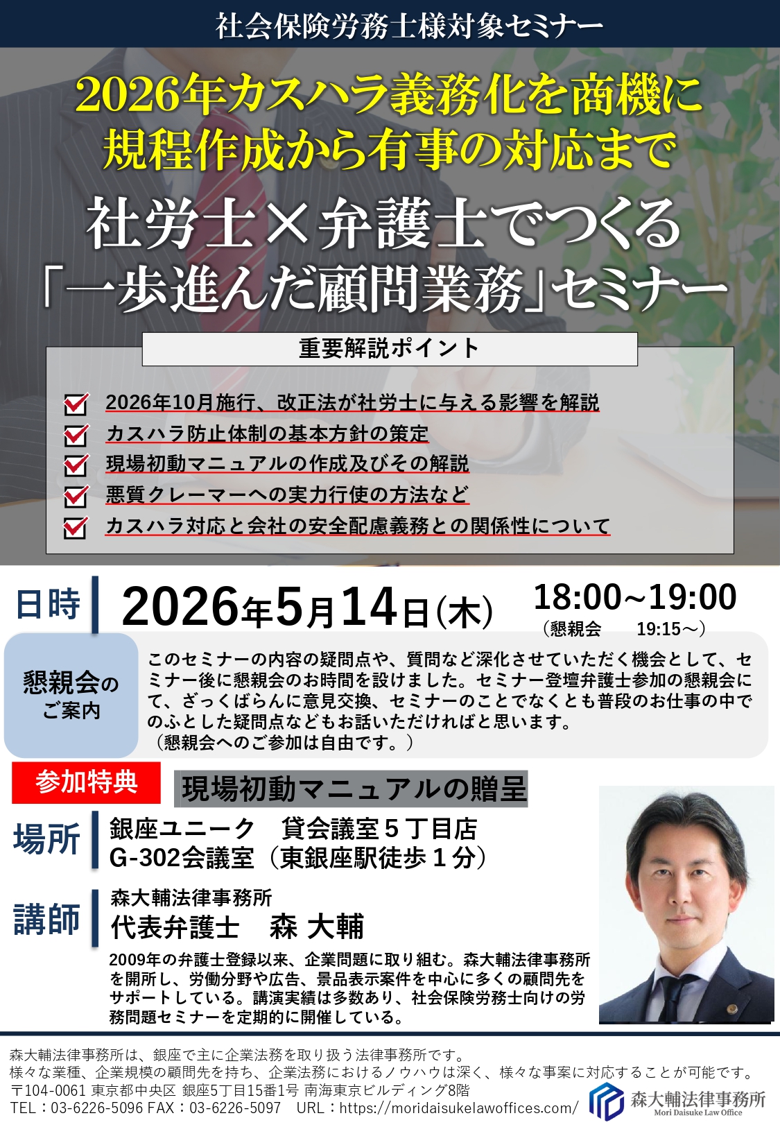 2026年5月14日(木)、【社労士様向け】2026年カスハラ義務化を商機に規程作成から有事の対応まで 社労士✕弁護士でつくる 「一歩進んだ顧問業務」セミナー