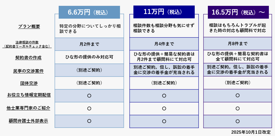 2回目以降の法律相談を継続して希望される場合は、月額6.6万円(税込)からの顧問契約プランのご利用をお願いしております。
